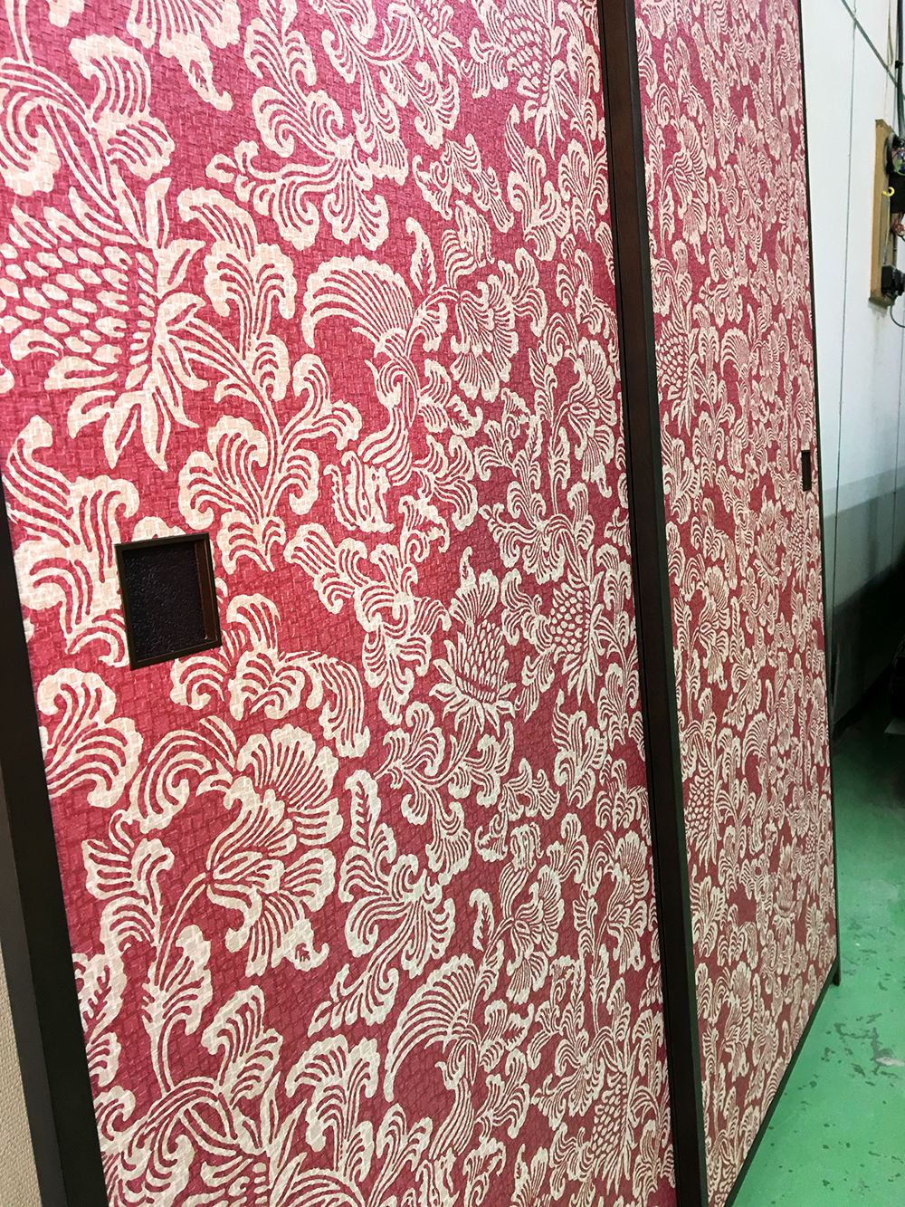 2019.06.28 押入襖 ビニールクロス 「BIGACE 2018-2020」_BA3296 押入襖の製作をご依頼いただきました! すごいのキタ━━━(゚∀゚)━━━!!派手 目が覚めるような柄。ボコボコした質感ですね。 ビニールクロスを貼っています。 <部材情報> ビニールクロス: 表)シンコール株式会社_「BIGACE 2018-2020」_BA3296 裏)雲華紙(ビニールクロスではありません) 引手:株式会社ツキエス_S-157 大 縁:塗装縁 本サイト上の素材(イラスト、写真、テキスト等)を、許可なく使用、転載することを禁止しております。本サイトの著作権につきましては、サイト利用規約をご覧ください。